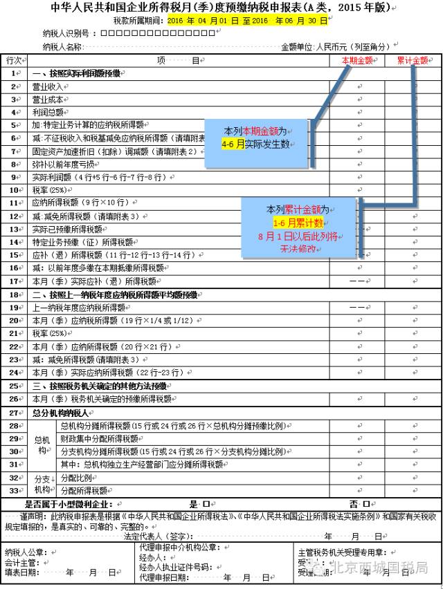 以2016年第二季度企业所得税申报为例,本期金额为2016年4月1日至2016年6月30日的数额,累计金额为2016年1月1日至2016年6月30日的累计数额。(见下图)