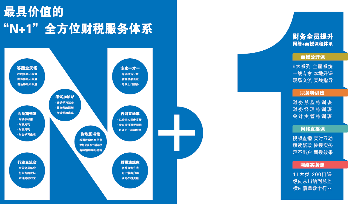 新会员体系优化了原有的服务项目和内容:一是扩充了“N+1”,“1”即课程,包括面授公开课、职务特训班(财务经理、会计主管、财务总监)、网络直播课、网络实务课,“N”是服务,包括专家一对一、答疑全天候、内训直通车、行业交流会、财税图书馆、会员期刊室、考试加油站、财税法规库等;二是增加会员专享的网络直播课程;三是增加了会员专享的由全国会员年会、行业专题论坛、本地财税沙龙等活动。