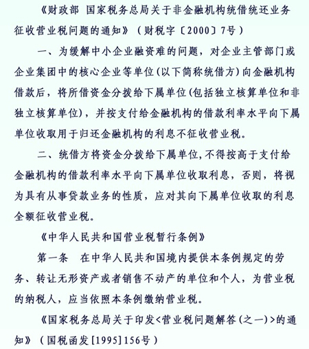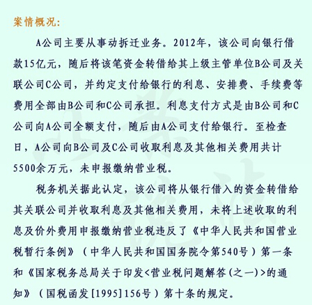 A公司将从银行借入的资金转借给上级主管单位及其关联公司并收取利息及其他相关费用,未申报缴纳营业税。税务机关在例行检查中发现该问题,遂责令企业补缴相应税款,并加收相应滞纳金。税官建议:企业应充分了解银行贷款资金统借统还业务的相关政策法规,避免出现纳税错误。