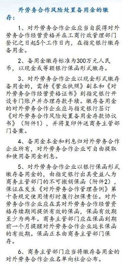 对外劳务合作风险处置备用金是指对外劳务合作企业缴存,用于《对外劳务合作管理条例》第十条所规定使用范围的专用资金。如何缴存外劳务合作风险处置备用金?详戳下图↓