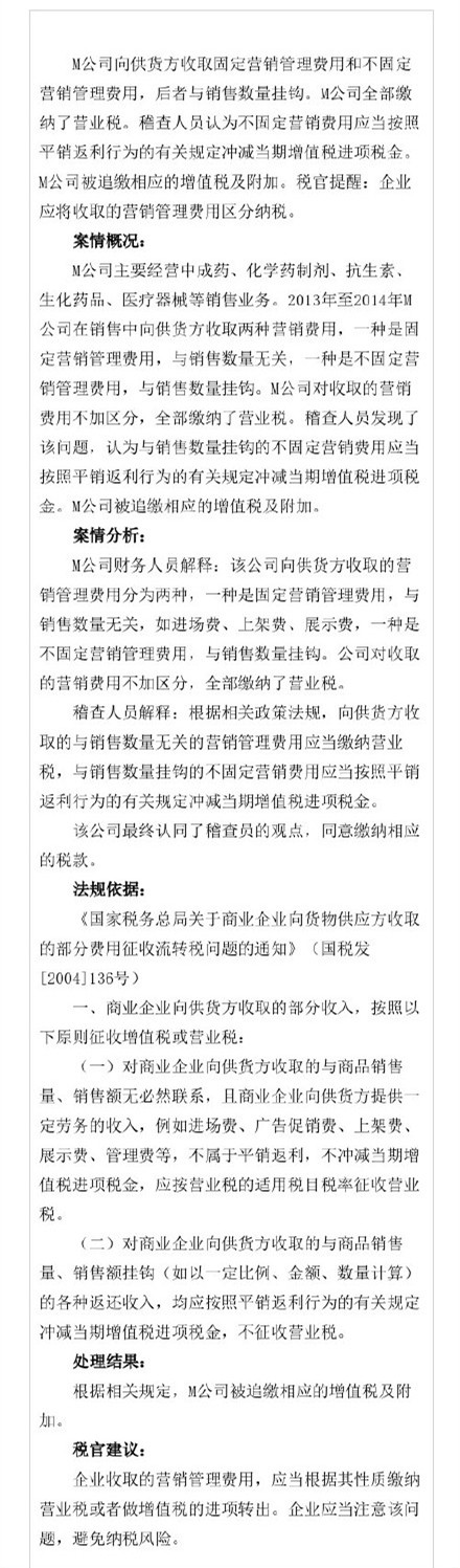 M公司向供货方收取固定营销管理费用和不固定营销管理费用,后者与销售数量挂钩。M公司全部缴纳了营业税。稽查人员认为不固定营销费用应当按照平销返利行为的有关规定冲减当期增值税进项税金。M公司被追缴相应的增值税及附加。