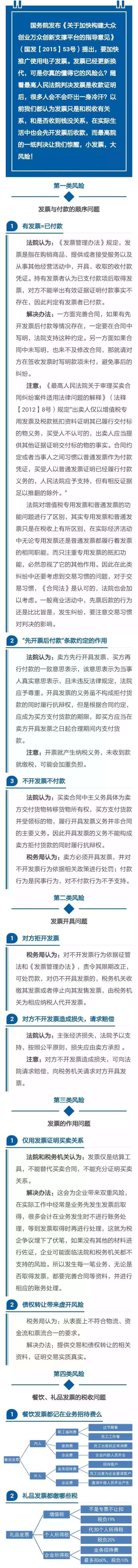 国务院发布《关于加快构建大众创业万众创新支撑平台的指导意见》(国发[2015]53号)提出,要加快推广使用电子发票。发票已经更新更代,可是你真的懂得它的风险么?随着高人民法院判决发票是收款证明后,很多人会不会吓出一身冷汗?以前我们都认为发票知识和税收有关系,和是否收到钱没关系,在实际生活中也会先开发票后收款,而高院的一纸判决让我们惊醒,小发票,大风险。