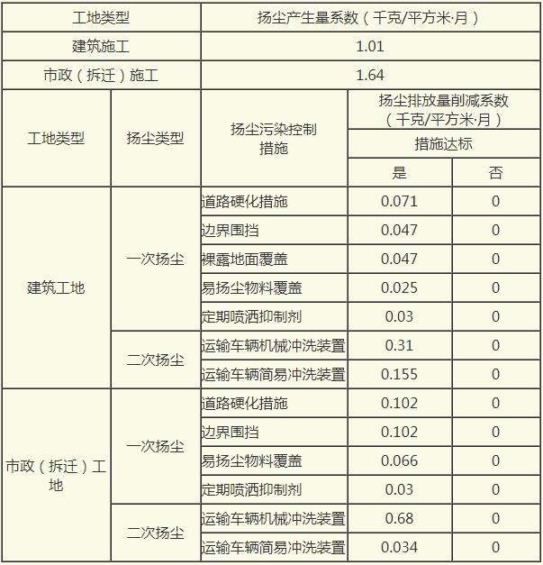 扬尘排放量=(扬尘产生量系数-扬尘排放量削减系数)(千克/平方米·月)×月建筑面积或施工面积(平方米)