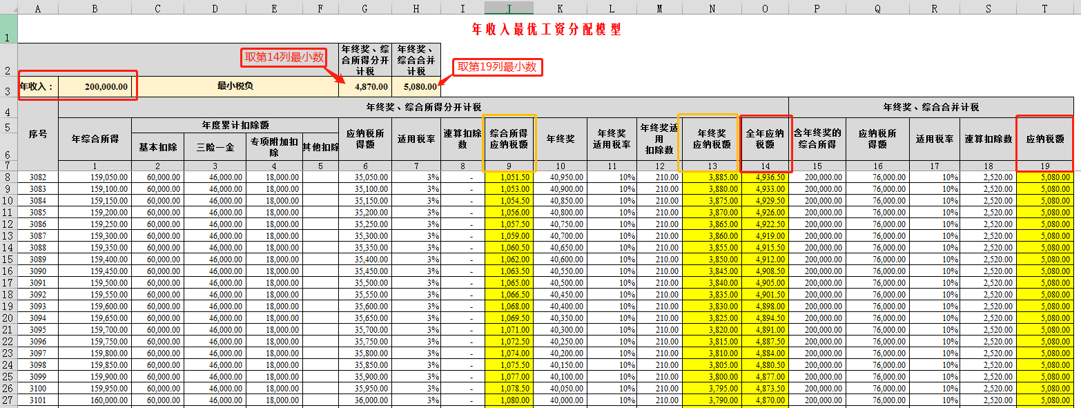 2.第10列=年收入-年综合所得= $B$3-B8。