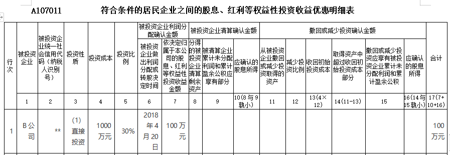 话不多说,我们举例来看:A公司直接投资B公司(纳税人识别号:**)30%股权,投资成本1000万元,并将该股权作为长期股权投资的权益法核算,2018年4月20日B公司做出利润分配,分配A公司现金股利100万元,2018年度A公司账面确认B公司的投资收益共计150万元。