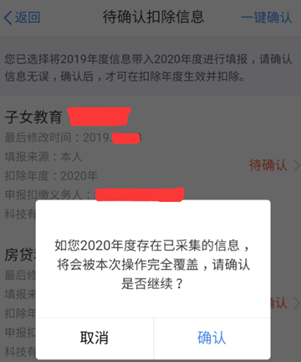 3、经过第2步的确认,将会出现2019年度已经填报过的转项附加扣除信息,如果没有变化,符合条件的,可以选择“一键确认”;