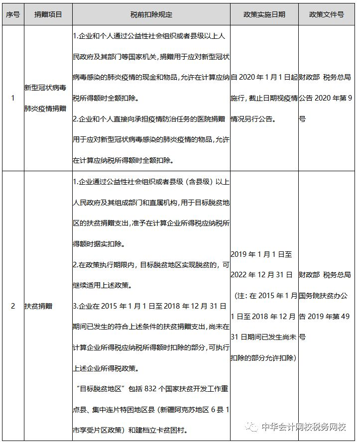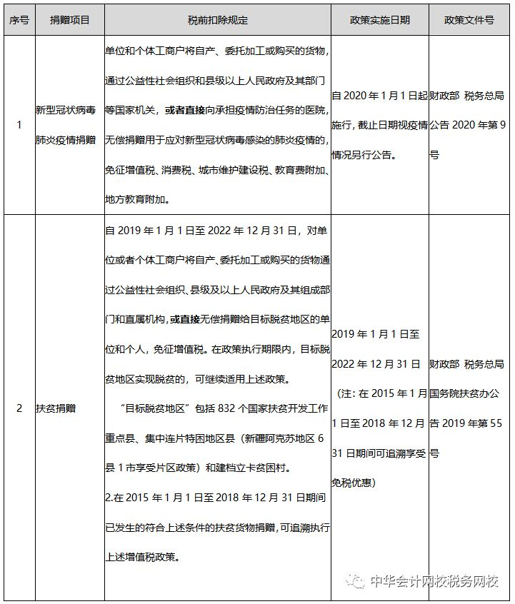 在疫情期间,财政部和国税总局出台公告规定企业和个人捐赠用于应对新型冠状病毒感染的肺炎疫情的现金和物品,允许在计算应纳税所得额时全额扣除。那么,除了新冠状疫情捐赠全额扣除外,截至目前还有那些公益性捐赠可以全额在税前扣除呢?现整理如下: