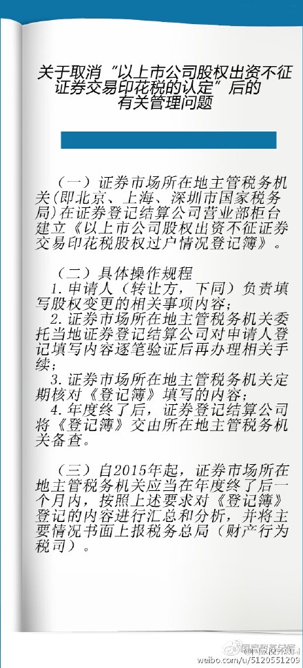 税务总局发公告明确:“以上市公司股权出资不征证券交易印花税的认定”取消后,证券市场所在地主管税务机关在证券登记结算公司营业部柜台建立《以上市公司股权出资不征证券交易印花税股权过户情况登记簿》,并规定了具体操作要求。
