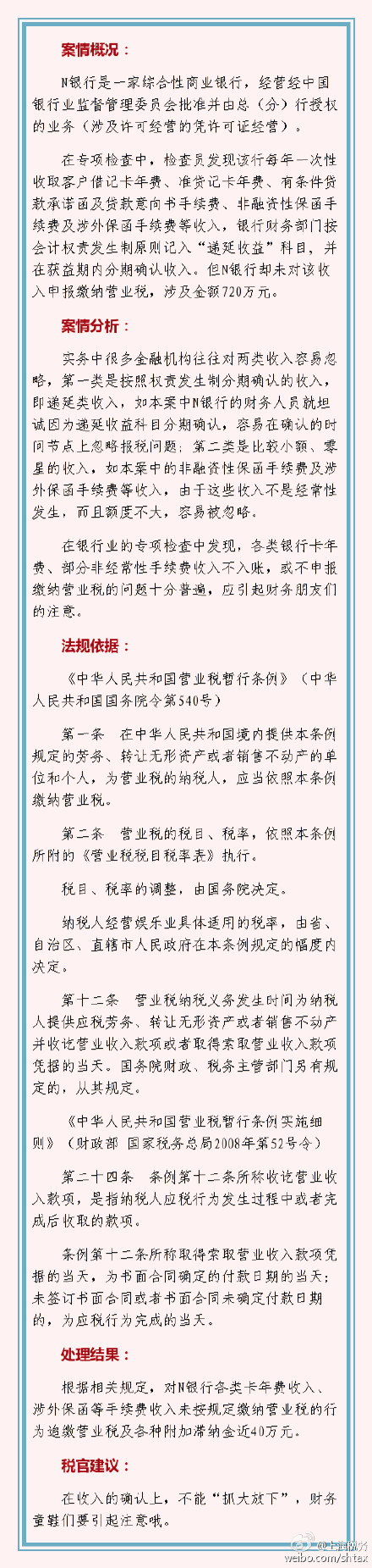 N银行收取客户借记卡年费、准贷记卡年费、有条件贷款承诺函及贷款意向书手续费、非融资性保函手续费及涉外保函手续费等记入递延收益分期确认收入,但未对该收入申报缴纳营业税,被税务机关追缴40多万元。税官提醒:零星收入易忽略,小钱也不能“任性”哦。
