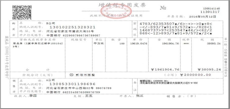 例4:A公司为一般纳税人,出售其2016年4月30日前购入房产1套给B公司,取得含税收入200万元,房产购入原价120万元,选择简易计税方法,开具增值税专用发票。发票开具方法如下:首先,进入开票页面,点击页面上方“差额”按钮;第二步,录入扣除额120万元;第三步,发票金额栏录入含税销售额200万元,系统自动计算金额(不含税)和税额,填写在相应栏次(计算过程:税额=(2000000-1200000)÷(1+5%)×5%=38095.24元;金额(不含税)=2000000-38095.24=1961904.76元)。