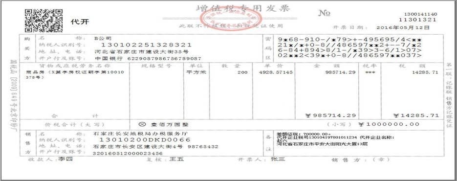 例5:赵六,出售其购入写字楼一套给B公司,购买方为一般纳税人,取得含税收入100万元,房产购入原价70万元,向地税局申请代开增值税专用发票。发票开具方法如下:首先,进入开票页面,点击页面上方“差额”按钮;第二步,录入扣除额70万元;第三步,发票金额栏录入含税销售额100万元,系统自动计算金额(不含税)和税额,填写在相应栏次(计算过程:税额=(10,0000-700000)÷(1+5%)×5%=14285.71元;金额(不含税)=1000000-14285.71=985714.29元)。