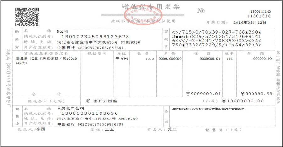 例8:A房地产公司将一栋楼价税合计1000万元销售给M公司,开具增值税专用发票,允许扣除的土地价款100万元。计算金额(不含税)、税额方法如下:税额=10000000÷(1+11%)×11%=990990.99元;金额=10000000-990990.99=9009009.01元;按照上述金额(不含税)和税额开具增值税专用发票。M公司取得增值税专用发票后,可以抵扣进项税额990990.99元。