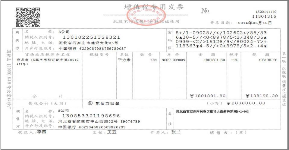 例3:A公司为一般纳税人,出售其2016年5月1日后购入(自建)房产1套,取得含税收入200万元,开具增值税专用发票。计算金额(不含税)、税额方法如下:税额=2000000÷(1+11%)×11%=198198.20元;金额=2000000-198198.20=1801801.80元;按照上述金额和税额开具增值税专用发票。