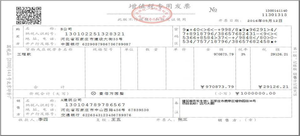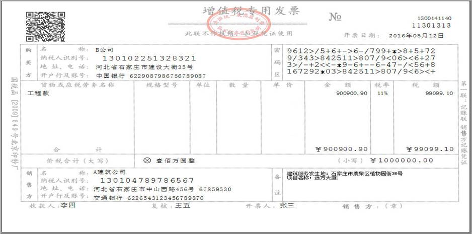 例1:A建筑公司为一般纳税人,采用一般计税方式核算。收取B公司工程款100万元,开具增值税专用发票。计算金额(不含税)、税额方法如下:税额=1000000÷(1+11%)×11%=99099.10元;金额=1000000-99099.10=900900.90元;按照上述金额和税额开具增值税专用发票。B公司取得增值税专用发票后,可以抵扣进项税额99099.10元。