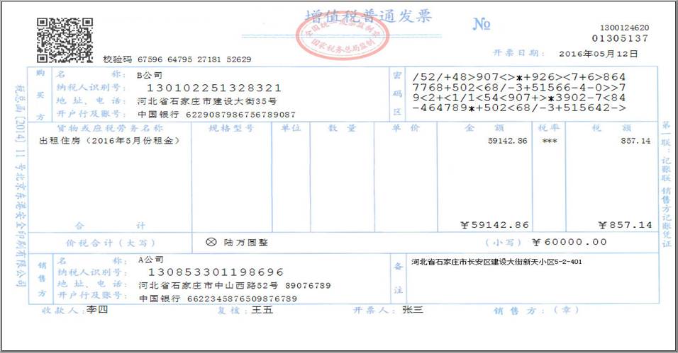 例6:A公司为小规模纳税人,出租一套自有住房给B公司,收取5月份租金60000元。自行开具(代开)增值税普通发票。发票开具方法如下:首先,选择新系统中征收率减按1.5%征收开票功能。第二步,金额录入含税销售额。第三步,系统自动计算税额和金额(不含税)(计算过程:税额=60000÷(1+5%)×1.5%=857.14元;金额(不含税)=60000-857.14=59142.86元)。