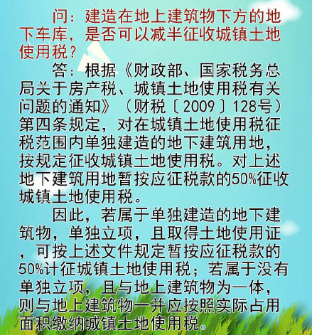 建造在地上建筑物下方的地下车库,是否可以减半征收城镇土地使用税呢?网校小编搜集了相关政策,供您参考,详情见下图: