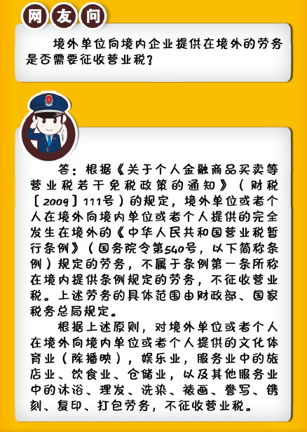 境外单位向境内企业提供在境外的劳务是否需要征收营业税?小编搜集了相关规定,供您参考,希望对您有所帮助,详情如下图: