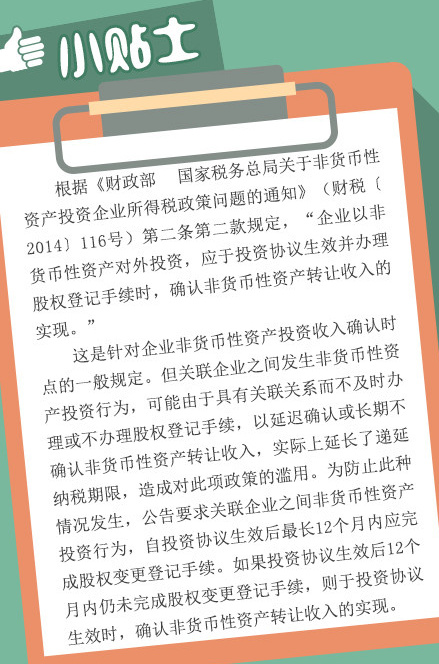 国家税务总局公告2015年第33号要求,关联企业之间非货币性资产投资行为,自投资协议生效后最长12个月内应完成股权变更登记手续。如果投资协议生效后12个月内仍未完成股权变更登记手续,则于投资协议生效时,确认非货币性资产转让收入的实现。为啥这么规定↓