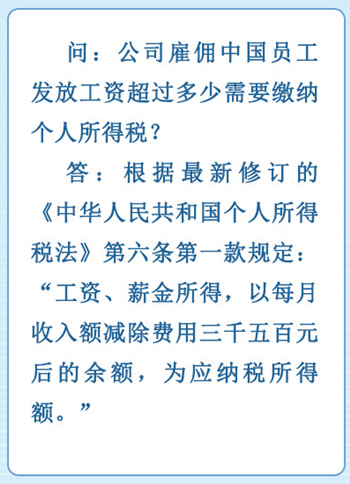 公司雇佣中国员工发放工资超过多少需要缴纳个人所得税?小编搜集了相关规定,供您参考,希望对您有所帮助。