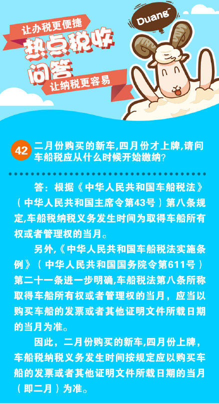 车船税纳税义务发生时间为取得车船所有权或者管理权的当月。因此,二月份购买的新车,四月份上牌,车船税纳税义务发生时间按规定应以购买车船的发票或者其他证明文件所载日期的当月(即二月)为准。