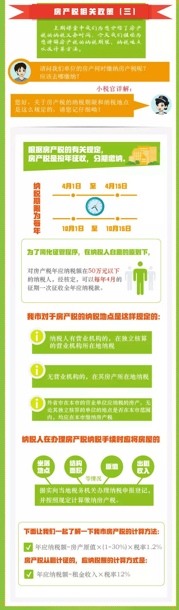 上一期,我们为您介绍了房产税的纳税义务时间,今天我们继续为您介绍房产税的纳税期限、纳税地点以及计算方法。