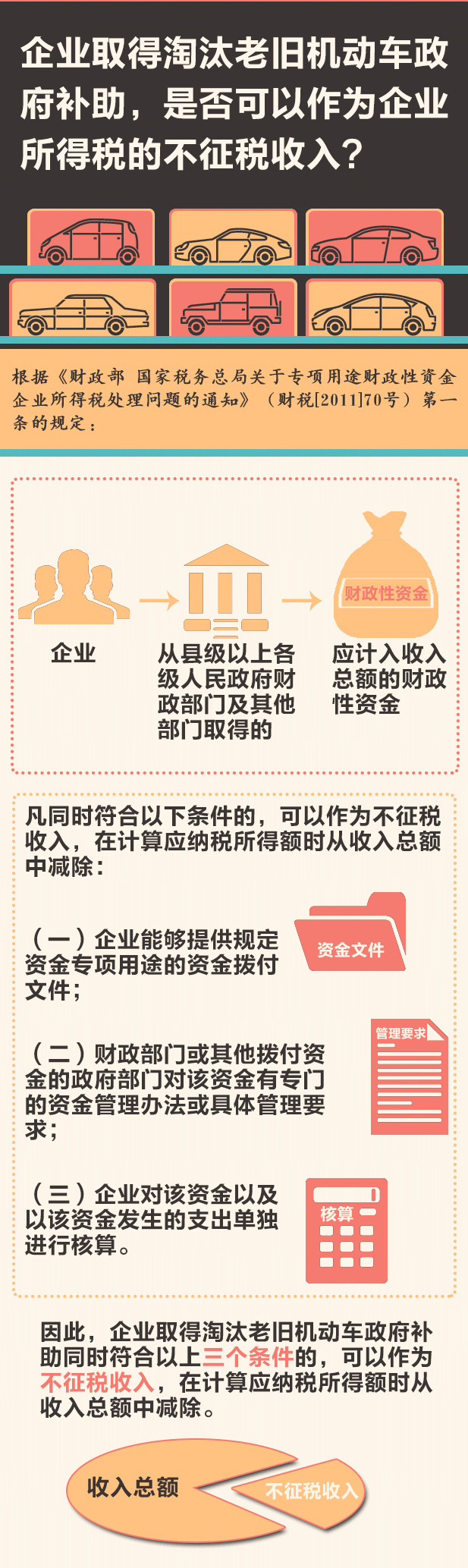 企业取得淘汰老旧机动车政府补助,是否可以作为企业所得税的不征税收入?小编搜集了相关政策规定,希望对您有所帮助,详情如下图: