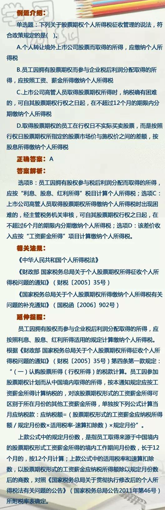 最近,有很多学员咨询股票期权个人所得税相关征管问题,下面小编用一道例题让大家轻松搞懂股票期权个人所得税有关的征管问题,不懂的小伙伴赶紧看过来吧~