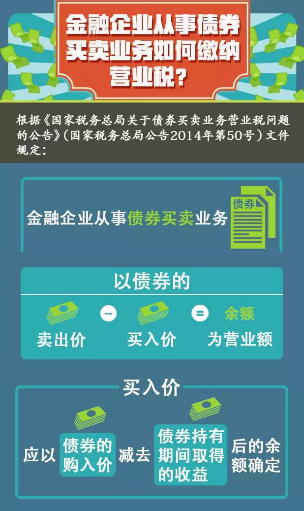 金融企业从事债券买卖业务如何缴纳营业税?小编搜集了相关政策规定,希望对您有所帮助,详情如下图: