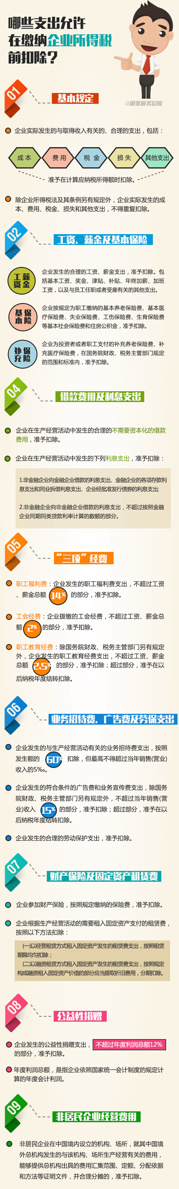 按照企业所得税法的规定,企业实际发生的与取得收入有关的、合理的支出,包括成本、费用、税金、损失和其他支出,准予在计算应纳税所得额时扣除。具体包括哪些支出,一张图告诉你↓