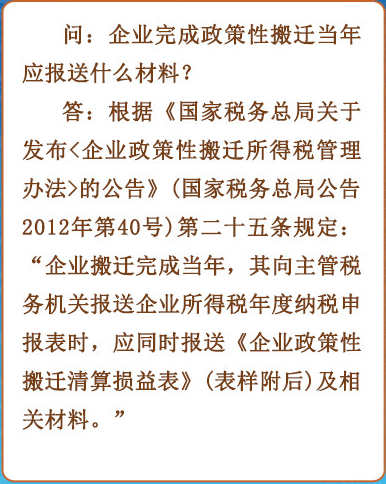 企业完成政策性搬迁当年应报送什么材料?小编搜集了相关政策规定,希望对您有所帮助,详情如下图: