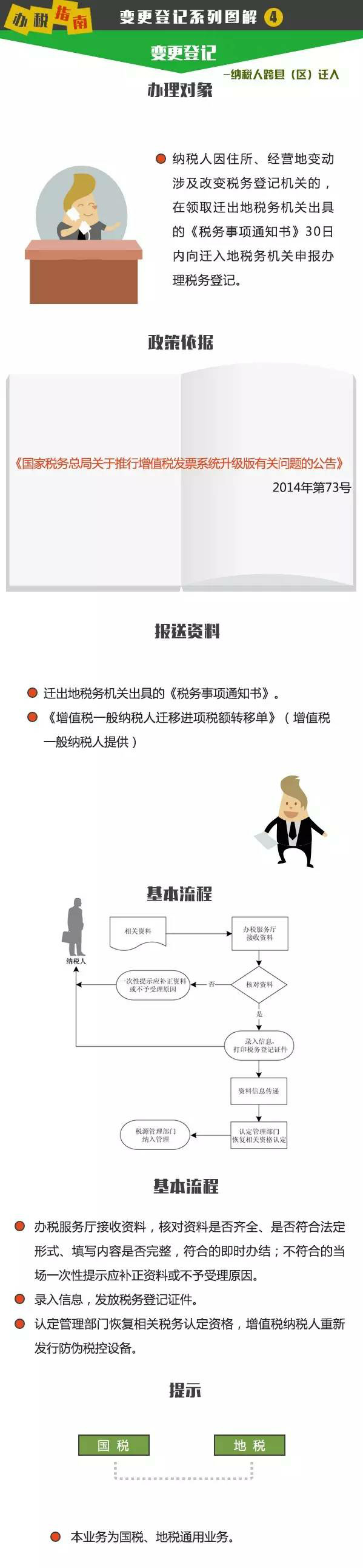纳税人因住所、经营地变动涉及改变税务登记机关的,在领取迁出地税务机关出具的《税务事项通知书》30日内向迁入地税务机关申报办理税务登记。纳税人跨县(区)迁入需要提交什么材料?基本流程又是什么?一图读懂↓↓