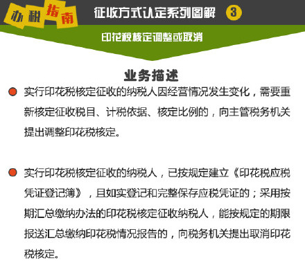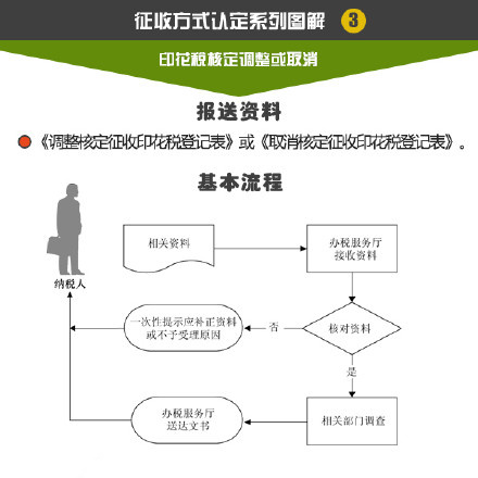 实行印花税核定征收的纳税人因经营情况发生变化,需要重新核定征收税目、计税依据、核定比例的,向主管税务机关提出调整印花税核定。需要什么材料?基本流程又是什么?4图读懂↓↓↓