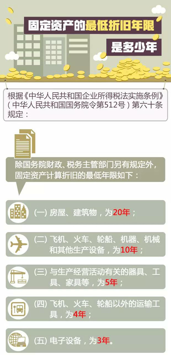 各种固定资产的最低折旧年限是多少年呢?小编搜集了相关的政策规定,希望对您有所帮助,详情如下图: