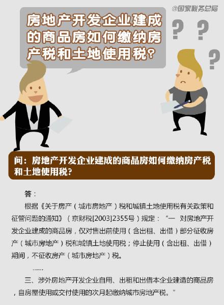 房地产开发企业建成的商品房该如何缴纳房产税和土地使用税呢?小编搜集了相关政策规定,希望对您有所帮助!详情如下图:
