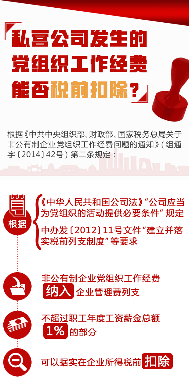 私营公司发生的党组织工作经费能否税前扣除?小编搜集了相关政策规定,希望对您有所帮助,详情如下图: