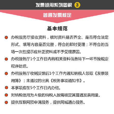 对已办理税务登记需要领用发票的单位和个人,税务机关依据其申请核定其领用发票的种类、单次(月)领用数量、开票限额。具体流程是啥?需要注意哪些问题?提交神马材料?看图就知道↓↓↓