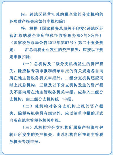 跨地区经营汇总纳税企业的分支机构的各项财产损失应如何申报扣除?小编搜集了相关政策规定,希望对大家有所帮助,详情如下图: