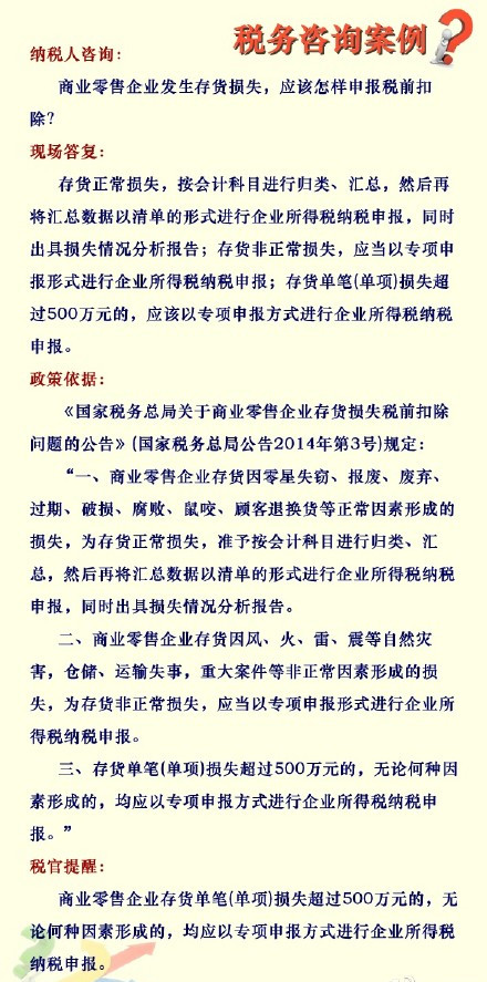 商业零售企业发生存货损失,应该怎样申报税前扣除?提醒:商业零售企业存货单笔(单项)损失超过500万元的,无论何种因素形成的,均应以专项申报方式进行企业所得税纳税申报。