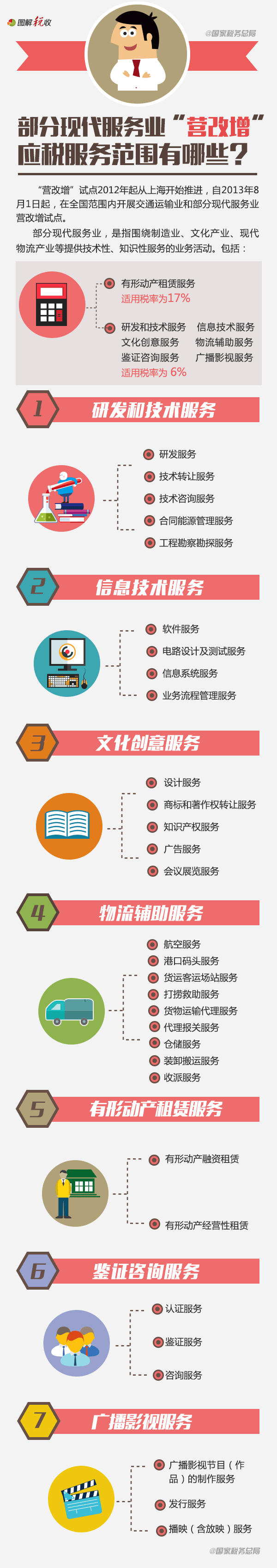 营改增”试点2012年起从上海开始推进,自2013年8月1日起,在全国范围内开展交通运输业和部分现代服务业营改增试点。那么,“营改增”后,部分现代服务业的应税服务范围包括哪些呢?戳图↓