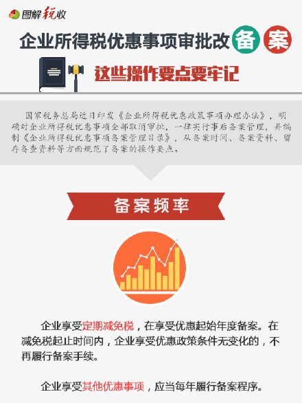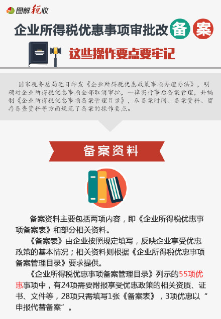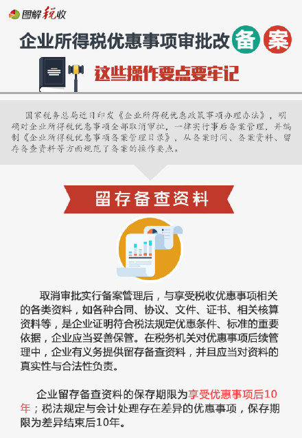 税务总局近日印发《企业所得税优惠政策事项办理办法》,明确对企业所得税优惠事项全部取消审批,一律实行事后备案管理,并编制《企业所得税优惠事项备案管理目录》,从备案时间、备案资料、留存备查资料等方面规范了备案的操作要点↓