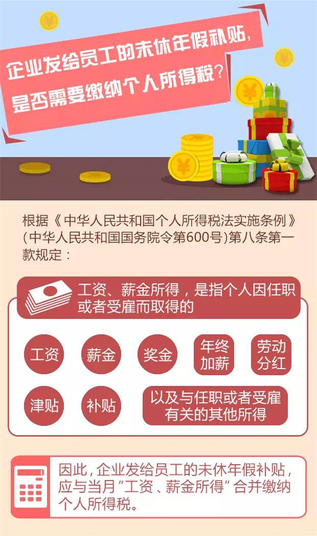 企业发给员工的未休年假补贴,是否需要缴纳个人所得税?小编搜集了相关政策规定,希望对您有所帮助。