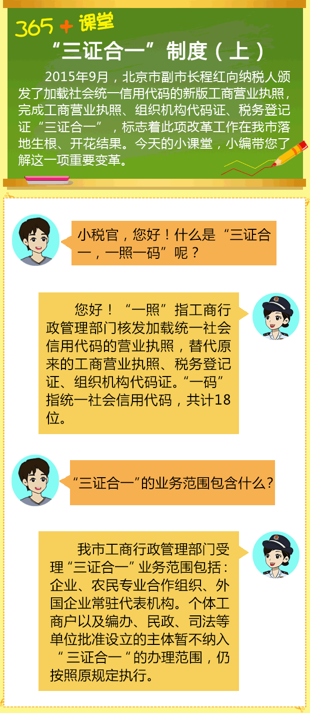 2015年9月,北京市副市长程红向纳税人颁发了加载社会统一信用代码的新版工商营业执照,完成工商营业执照、组织机构代码证、税务登记证“三证合一”,标志着此项改革工作在北京市落地生根、开花结果。今天的小课堂,小编带您了解这一项重要变革。