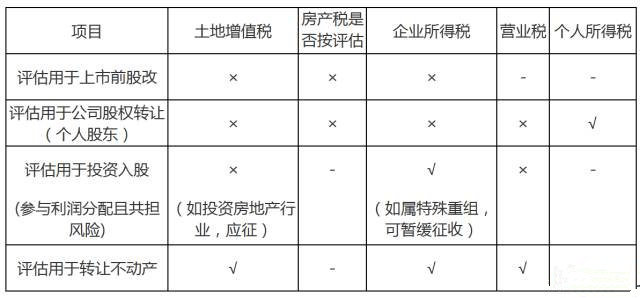 当然,财务们还会告诉小编,不动产评估是有用途的,小编很大方,扫除误区后给大家附赠常见情形下涉税对照表: