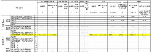 在第二大类“简易计税方法计税”的9b栏“5%征收率的服务、不动产和无形资产”的第1列“开具增值税专用发票销售额”,填入不含税销售额52860000元;第2列“开具增值税专用发票销项(应纳)税额”填入2640000元;第9列“合计销售额”填入52860000元;第10列“合计销项(应纳)税额”填入2640000元;第11列“合计价税合计”填入55500000元;第12列“服务、不动产和无形资产扣除项目本期实际扣除金额”填入45000000元;第13列“扣除后含税销售额”填入10500000元;第14列“扣除后销项(应纳)税额”填入500000元(如图1)。