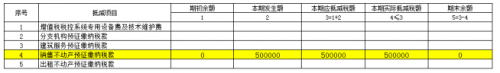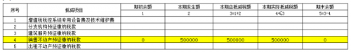 第4行“销售不动产预征缴纳税款”第1栏“期初余额”填写0;第2栏“本期发生额”填写计算出的本期预征税额500000元;第3栏“本期应抵减税额”填写期初余额与本期发生额之和500000元,由于本期应纳税额为500000元,因此本期发生的应抵减税额可全额抵减,第4栏“本期实际抵减税额”即填写500000元,第5栏“期末余额”填写本期应抵减税额与实际抵减税额之差0(如图3)。
