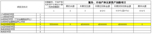 在第5栏“5%征收率的项目”的相应栏次内填入相应数据:第1列“本期服务、不动产和无形资产价税合计额(免税销售额)”等于附列资料(一)第11列第9b栏的金额,应为本期销售不动产价税合计额55500000元;第2列“期初余额”填入0;第3列“本期发生额”填入本期销售不动产的原值45000000元;第4列“本期应扣除金额”填入45000000元;第5列“本期实际扣除金额” 应保证小于本期发生的销售额且小于应扣除金额,填入45000000元;第6列“期末余额”填入0(如图2)。