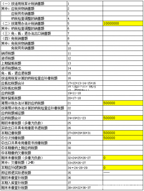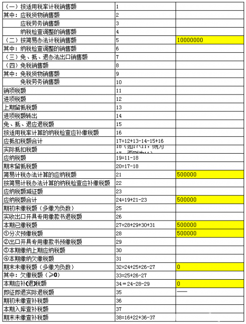 主表“一般项目”下的“本月数”第5栏“按简易办法计税销售额”内填写本期按简易办法计税的销售额10000000元,第21栏“简易计税办法计算的应纳税额”内填写根据简易计税办法计算出的税额500000元,在本期没有其他应纳税额项目的前提下,第24栏“应纳税额合计”内等于第21栏500000,将预缴的税款金额500000元填入第27栏“本期已缴税额”、第28栏“分次预缴税额”,在本期没有发生其他税款的情况下,第32栏“期末未缴税额”、第34栏“本期应补(退)税额”内填0(如图3)。