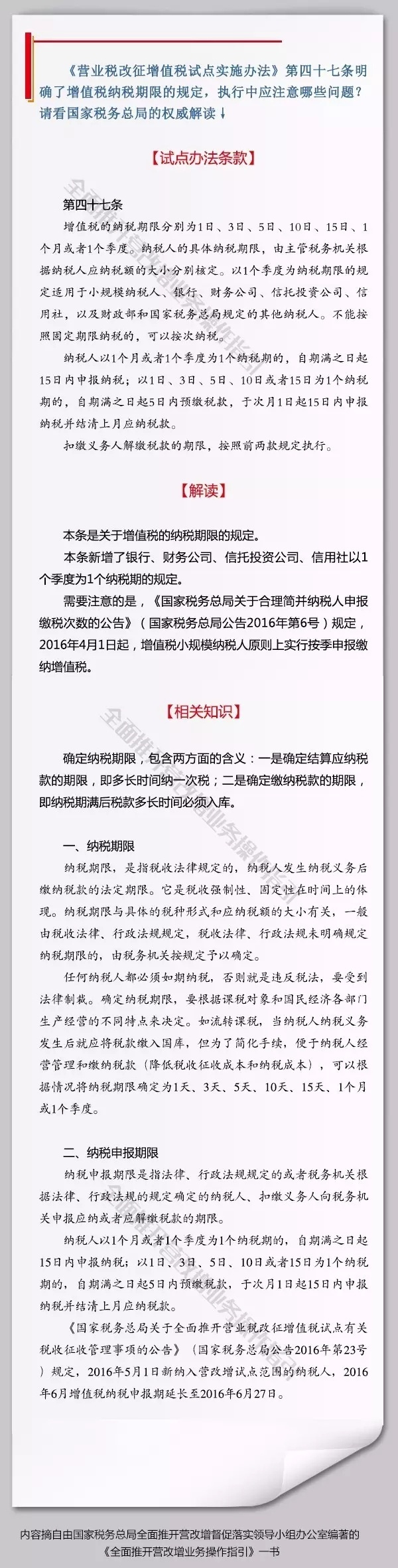 营业税改征增值税试点实施办法》第四十七条明确了增值税纳税期限的规定,执行中应注意哪些问题?请看国家税务总局的权威解读,戳图了解↓↓