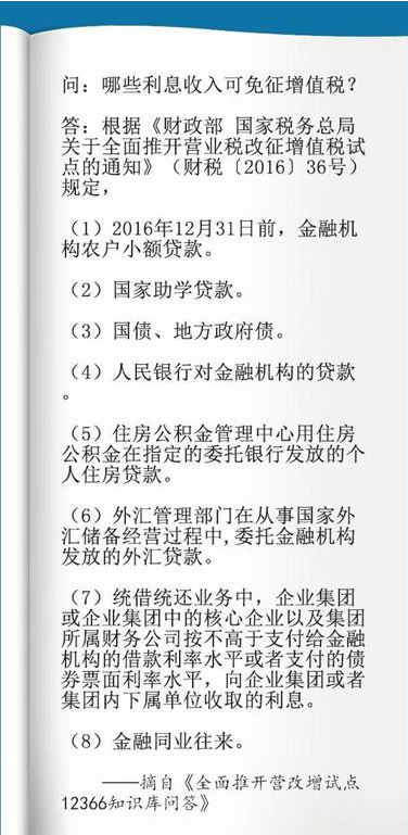 2016年5月1日,营业税改征增值税试点全面推开。根据《财政部 国家税务总局关于全面推开营业税改征增值税试点的通知》(财税〔2016〕36号)规定,八种情况的利息收入可免征增值税。