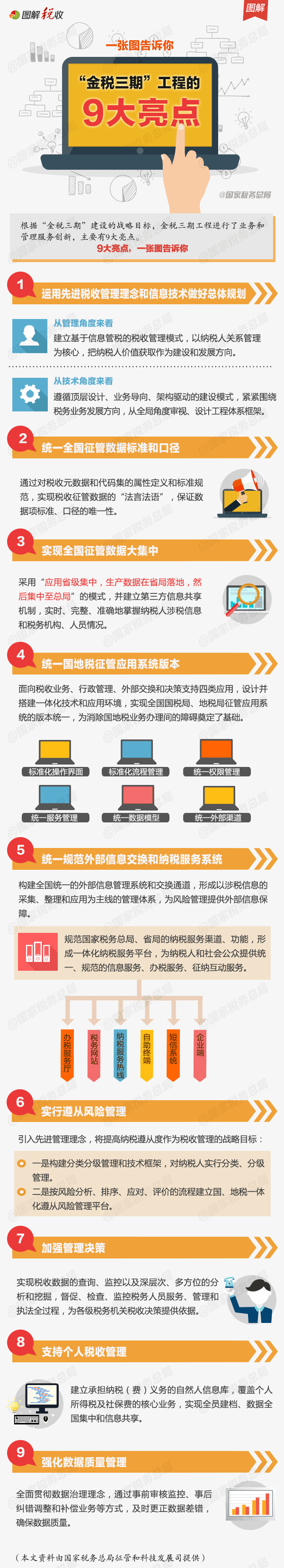 根据“金税三期”建设的战略目标,金税三期工程进行了业务和管理服务创新,主要有9大亮点。